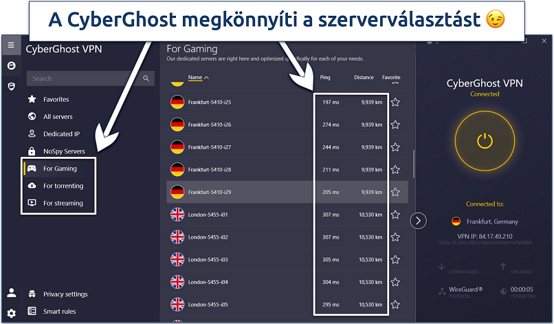 A VPN speciális szerverei segítségével egyszerűen megtalálhatod az igényeidnek megfelelő szervert. A próbaverzió aktiválása után elindítottuk a CyberGhostot, és másodpercek alatt csatlakoztunk egy streamelésre optimalizált szerverhez – nem kellett találgatnunk. Több, mint 100 speciális streaming helységgel könnyű megtalálni a különböző Netflix könyvtárakhoz, BBC iPlayerhez, Maxhoz és még sok máshoz legjobb opciókat. A játékszerverei érezhetően csökkentették a késleltetést, amikor más régiókban játszottunk online mérkőzéseket.